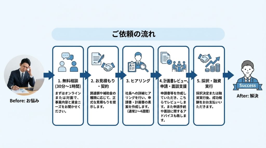 - 着手金:15万円〜(補助金の種類・規模により変動)